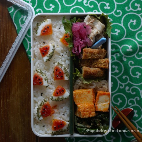 夏はやっぱりスイカ柄のお弁当 2025年07月23日 こんにちは。昨日はパパさんが出張のためお弁当はお休みでした今週はこのお弁当から…スイカ柄のお弁当味付け卵にケチャップを乗せ、皮の部分はドライパセリ、種は黒ごま種、こぼしてます今日のおかず・豚肉と大根の煮物・野菜フライ・紫玉ねぎの甘酢漬け・糸こんにゃくの旨 ... 続きを読む