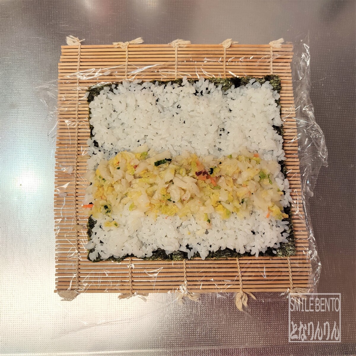 ③巻きすに海苔を乗せ、その上に➀のご飯を敷き、